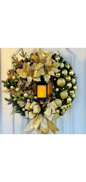 Outdoor Wreath for Front Door Decorations with Battery Operated LED Oil Lamp,Artificial Red Holiday Wreath with Red Bow/Wreath Hanger