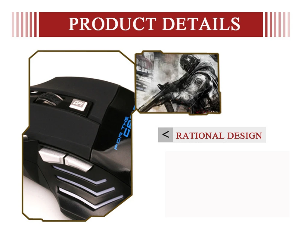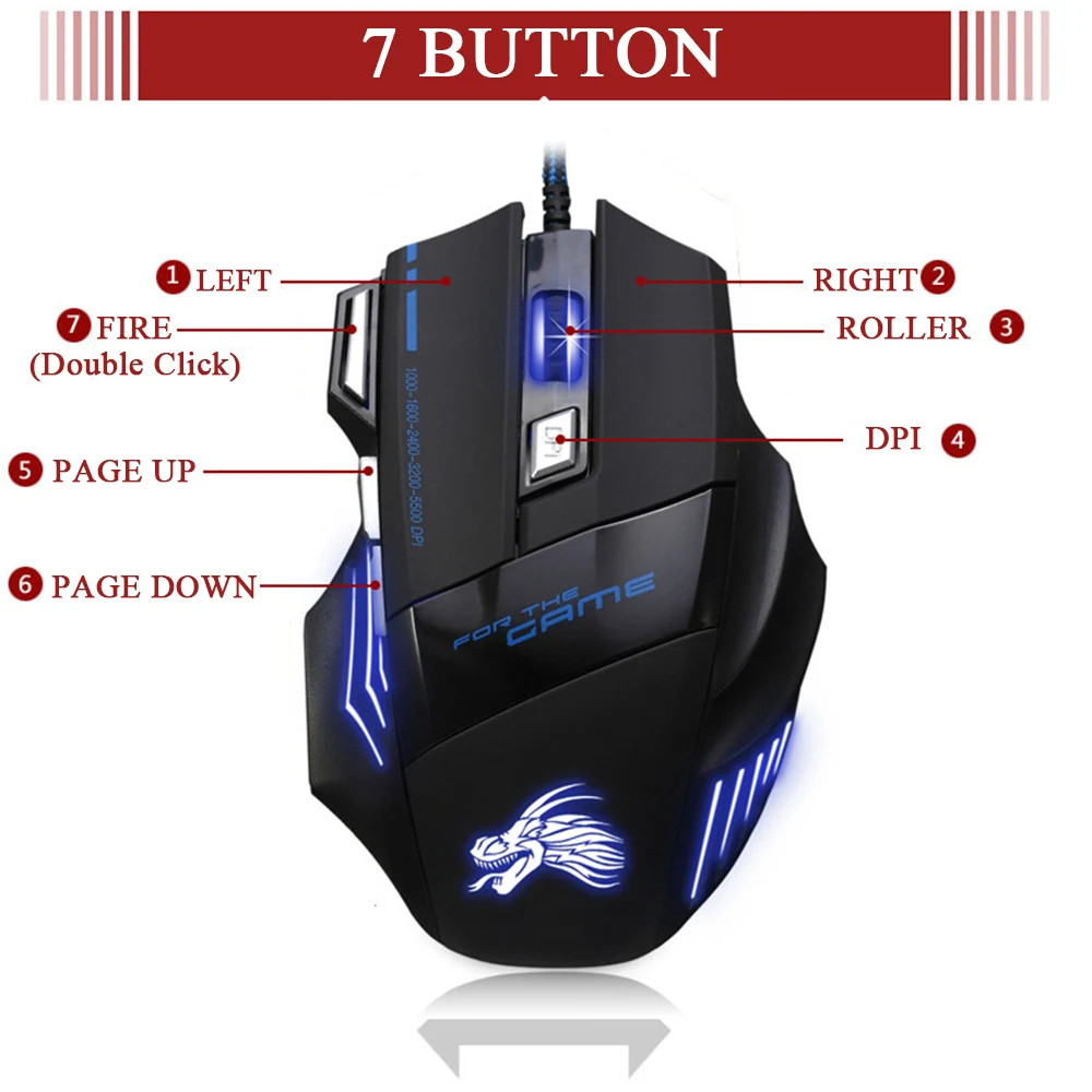 - Ajustable DPI Switch: 1000DPI / 1600DPI / 2400DPI / 3200DPI / 5500DPI;