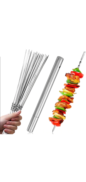 Unlike wood and bamboo sticks, stainless steel kabob skewers are reusable. The kebab skewers surface is smooth that grilled food residue won't get stuck onto the kabob skewer blade. After each time's use, just let these grilling skewers sit in warm water, hand wash with gentle detergent or threw them in dishwasher, wipe away water and keep in dry place, and they'll come out as new. The metal shish kabab skewers can be used time and time again. Definitely a money saver.